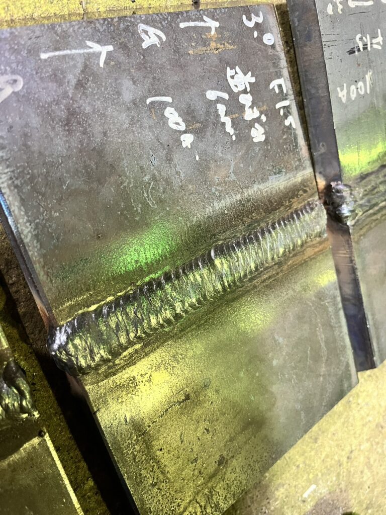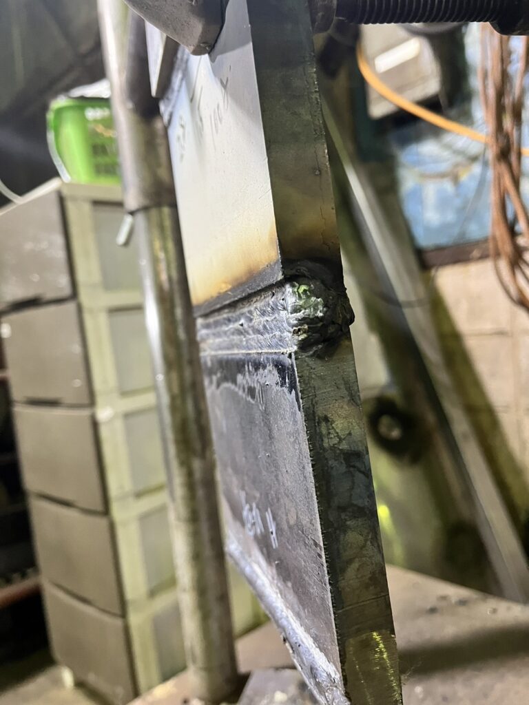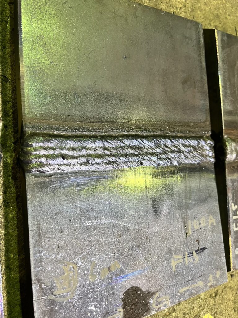 下、横、縦、上向きと4姿勢全ての裏波溶接で鉄板の厚みが19〜25ミリ(地方によって変わる)なのですが、やってみた感想としては上向きがちょっと難易度高く感じました。